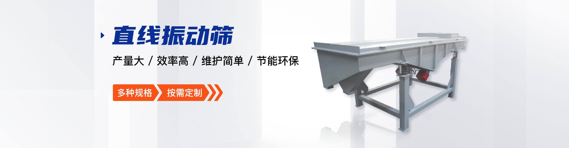公司的主要產(chǎn)品有:三次元旋振篩、直線振動篩、圓形搖擺篩、方形搖擺篩、脫水篩、超聲波振動篩、塑料振動篩、直排篩、高頻篩、450過濾篩、實驗篩、斗式提升機、皮帶輸送機、過濾器、振動電機等,